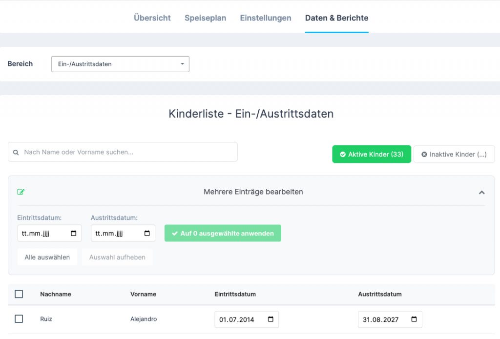 In der Kinderliste können Eintritts- und Austrittsdatum direkt in der Tabelle pro Kind angepasst werden.