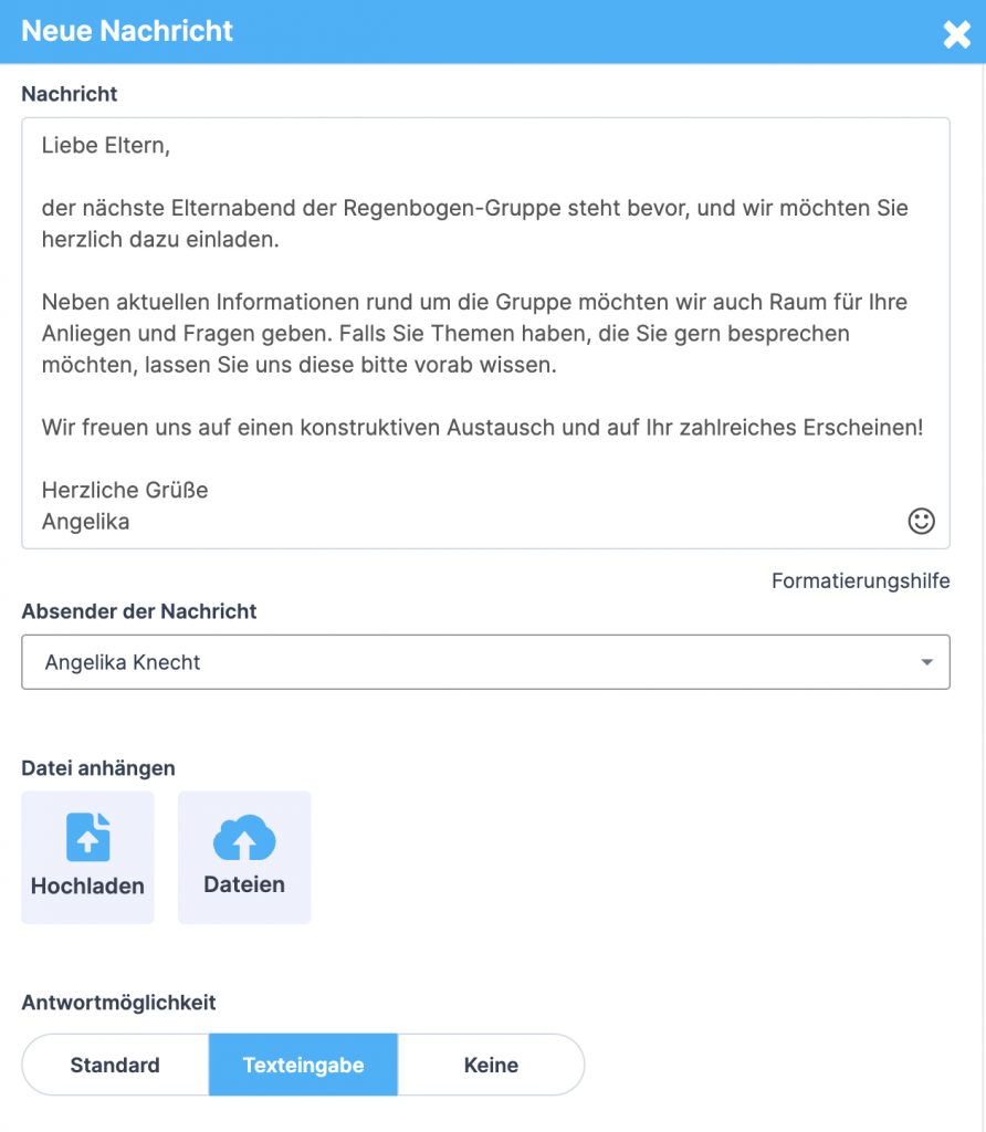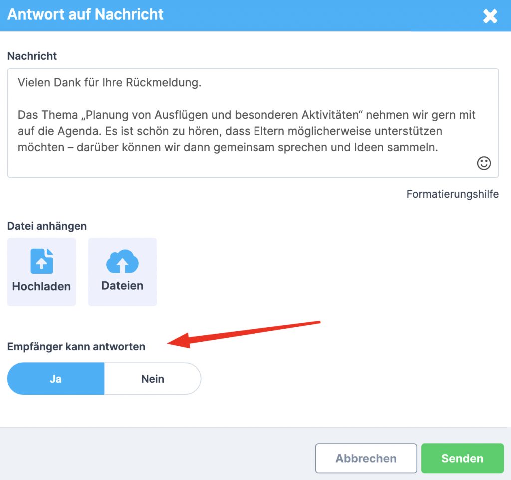 Bei jeder neuen Antwort der Einrichtung kann festgelegt werden, ob Eltern in der App erneut darauf antworten können oder ob die Kommunikation mit dieser Nachricht beendet wird.