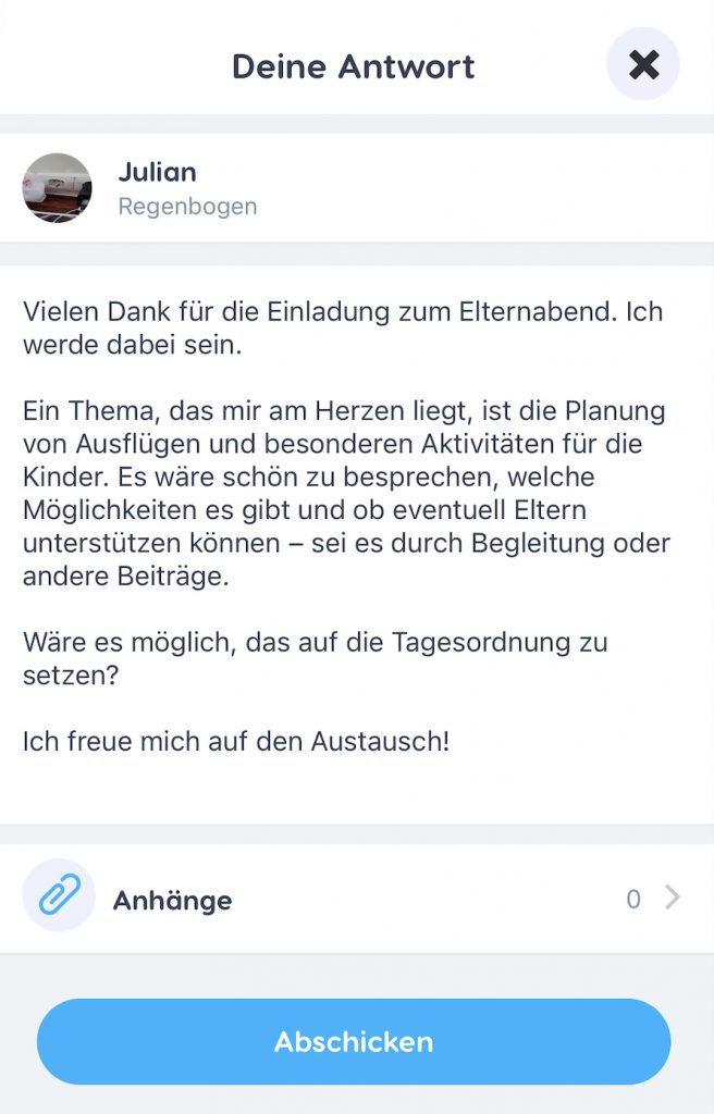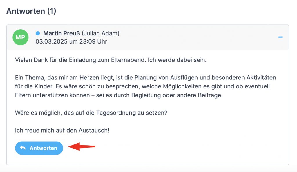 Über den Button “Antworten” kann direkt auf die Nachricht eines Elternteils geantwortet werden.