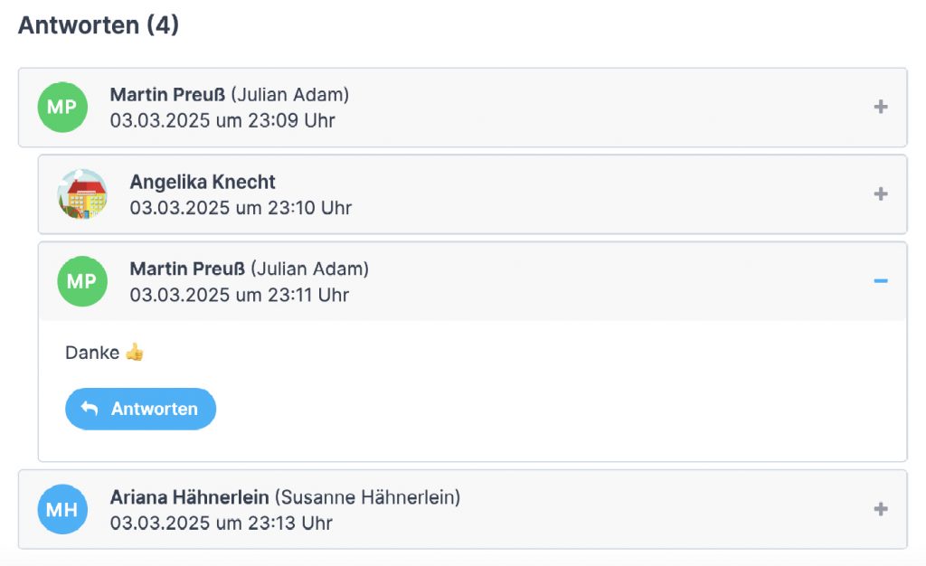 Diese Funktion ermöglicht der Einrichtung, den Austausch gezielt zu steuern – je nach Thema und Bedarf. So kann eine offene Rückkommunikation ermöglicht oder ein Gespräch nach einer abschließenden Antwort beendet werden.