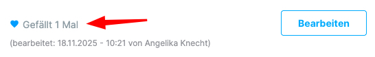 Auf der Pinnwand können Beiträge mit einem Like versehen werden. Wenn ein Beitrag mindestens einen Like erhalten hat, wird unter dem Beitrag ein Herz-Symbol mit dem Text „Gefällt X Mal“ angezeigt. Mit einem Klick auf diese Anzeige öffnet sich ein Fenster, das alle Personen auflistet, die den Beitrag geliked haben — inklusive Name und Zeitpunkt.